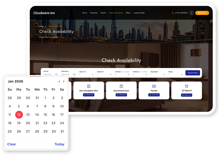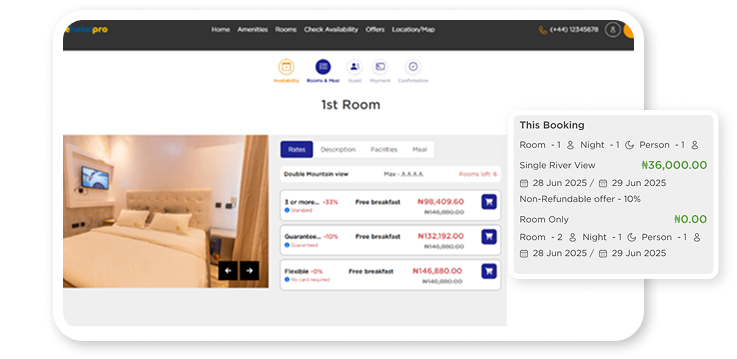 The pricing and room availability is always up to date as it is connected directly to the PMS and all your linked channels so any price changes are changed automatically in the Booking engine and likewise any bookings made on the frontdesk or a channel if you are connected will update the inventory on the booking engine for you.